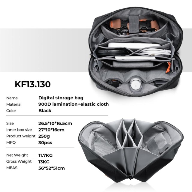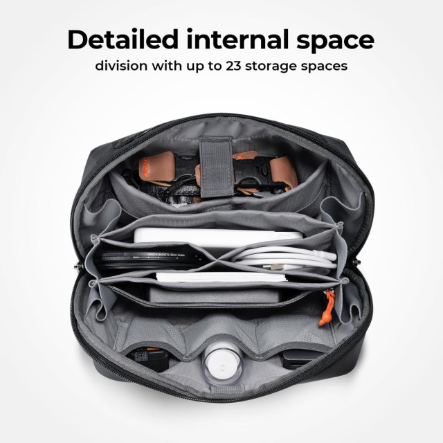 Ľahká konštrukčná koncepcia s detailným rozdelením vnútorného priestoru a až 23 úložnými miestami. Prehľadne a usporiadane do nej uložíte mobilné telefóny, nabíjačky, dátové káble, mobilné napájanie, USB flash disky, myši, kľúče od auta, bankové karty atď.