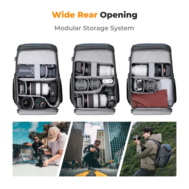 K&F Concept Camera Alpha Backpack Air 25L, Camera Bags for Photographers Large Capacity with Raincover - Backpack 25L Nature Wander 01(Blue). This photography backpack can be realized 5:5 and 2:8 space by pushing up or down for different needs. Suit for outdoor photography, urban street photography, outdoor portraits, VIOG photography, etc.