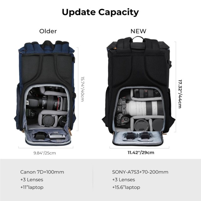 * 【Zvýšenie kapacity】17,32"*11,42"*6,69" (44x29x17cm) ; Tento batoh na fotoaparát pojme 1 fotoaparát + 3 objektívy + 7-11'' iPad + statív a ďalšie fotografické potreby.