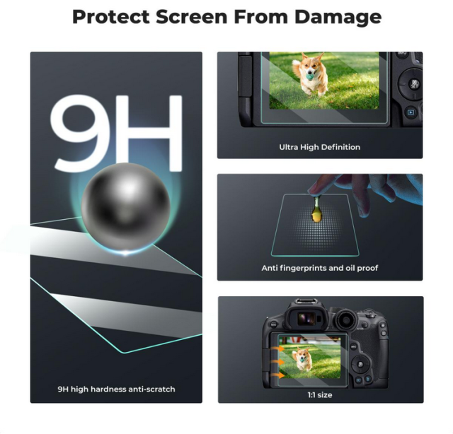 Súprava ochranných krytov obrazovky fotoaparátu K&F určená pre fotoaparáty Canon EOS R6 II, R6 a R7 obsahuje 3 ochranné kryty obrazovky, 3 kryty hot-shoe a vysávaciu čistiacu handričku. Táto súprava zaručuje, že displej vášho fotoaparátu zostane nedotknutý vďaka inštalácii bez bublín a vysokej ochrane.
