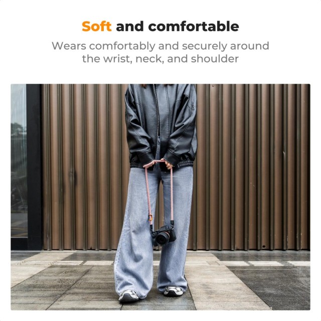 Ľahký a mäkký popruh poskytuje pohodlné nosenie okolo krku aj pri dlhodobom používaní, ideálny pre dlhé fotografické seansy.
