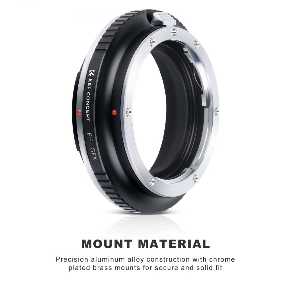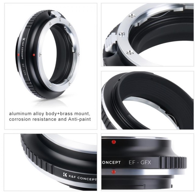 Adaptér objektívu K&F Canon EF na Fuji GFX umožňuje pripevniť objektívy Canon EOS s bajonetom EF na strednoformátové fotoaparáty Fujifilm GFX. Má odolnú kovovú konštrukciu a ponúka plne manuálne ovládanie.