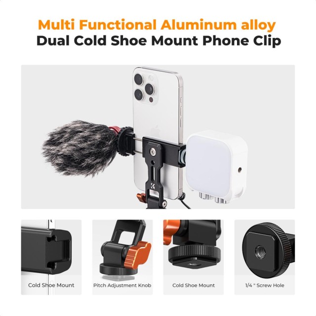 Držiak na statív telefónu je vybavený dvoma portami cold shoe na pripojenie mikrofónov, plniacich svetiel a ďalšieho príslušenstva. Okrem toho je možné porty studenej pätice otáčať a nastaviť tak uhol príslušenstva. Tento držiak na mobilný telefón podporuje snímanie s náklonom až 180° a 360° nastavenie uhla dookola, čím sa prispôsobí rôznym scenárom snímania. Uhol sklonu možno nastaviť na statíve alebo horúcej pätici fotoaparátu bez guľovej hlavy, čo uľahčuje jeho používanie.