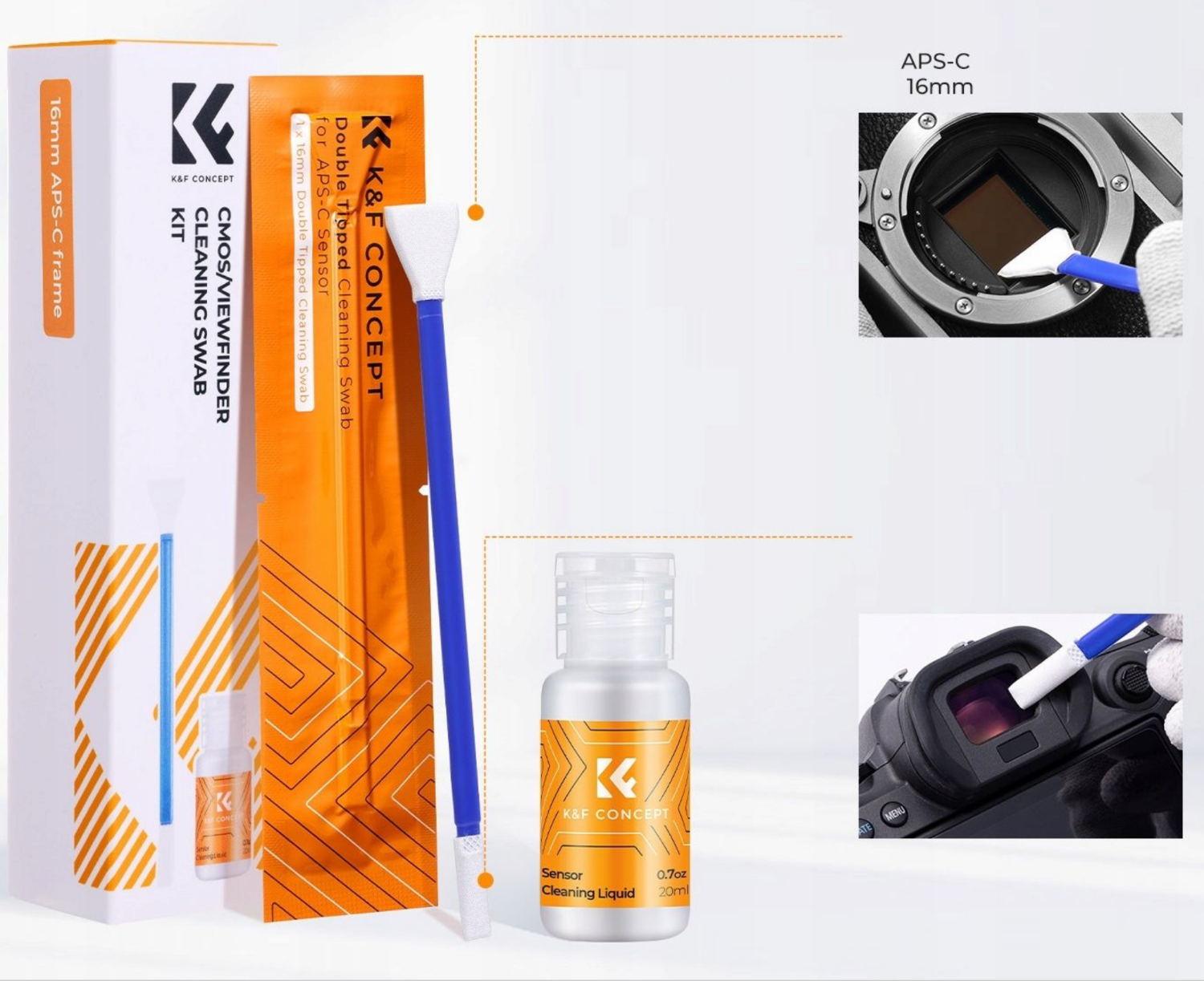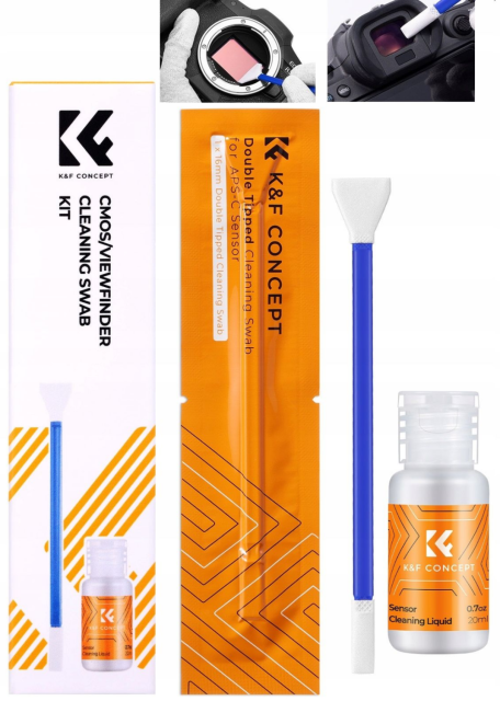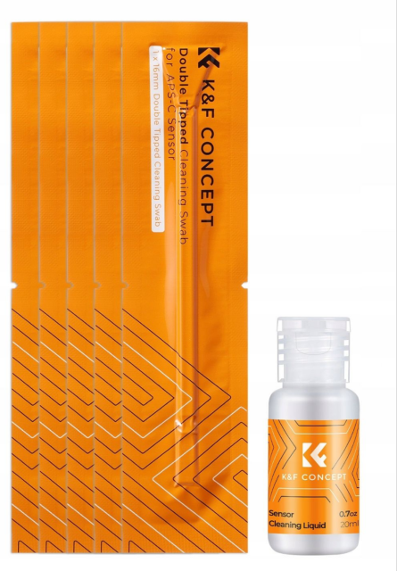 Súprava na čistenie fotoaparátov K&F Concept 2 v 1 je komplexné riešenie na bezpečné čistenie snímačov a hľadáčikov fotoaparátov APS-C, ktoré obsahuje čistiace tyčinky s dvojitým hrotom a 20 ml profesionálneho čistiaceho prostriedku na snímače.
