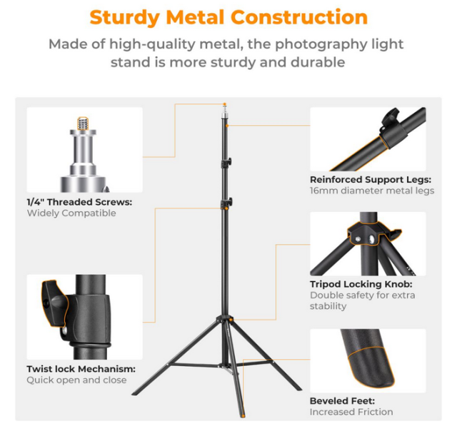 Stojan je vybavený statívovou základňou s predlžovacou tyčou, ktorá zvyšuje stabilitu, zatiaľ čo skladacie nohy a protišmykové nožičky zabezpečujú stabilitu stojana aj na nerovnom povrchu. Stojan s nastaviteľnou výškou od 80 cm do 200 cm (31,5" až 78,8") sa dokáže prispôsobiť rôznym scenárom snímania a poskytuje flexibilitu pri štúdiových alebo vonkajších nastaveniach.
