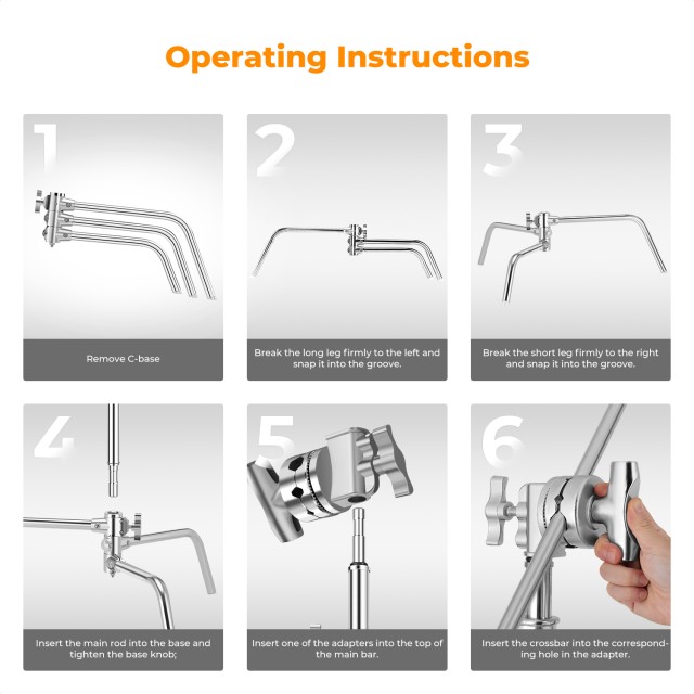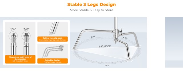 Konce priečnika sú vybavené 1/4" a 3/8" závitom, čo ponúka kompatibilitu so širokou škálou zariadení. Priložené adaptéry sú vhodné pre tyče s rôznym priemerom, čo zvyšuje všestrannosť. Skladacia základňa v tvare písmena C s protišmykovými podložkami poskytuje vynikajúcu stabilitu a kompaktné skladovanie. Na zvýšenie stability pri náročných nastaveniach možno použiť ďalšie vrecká s pieskom.