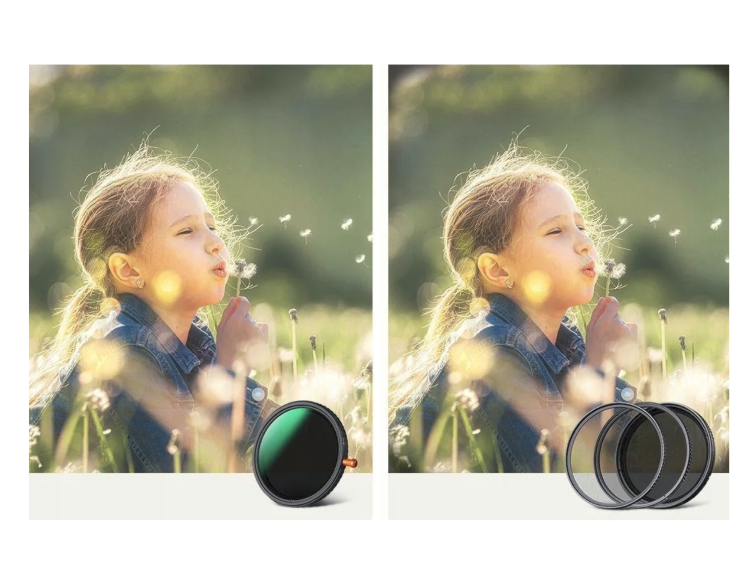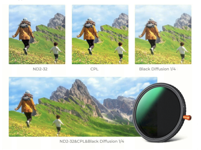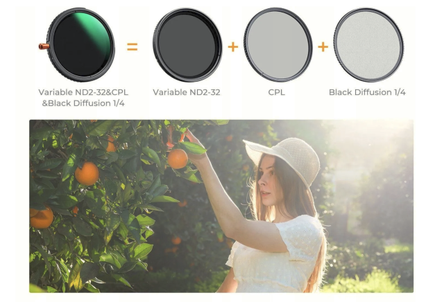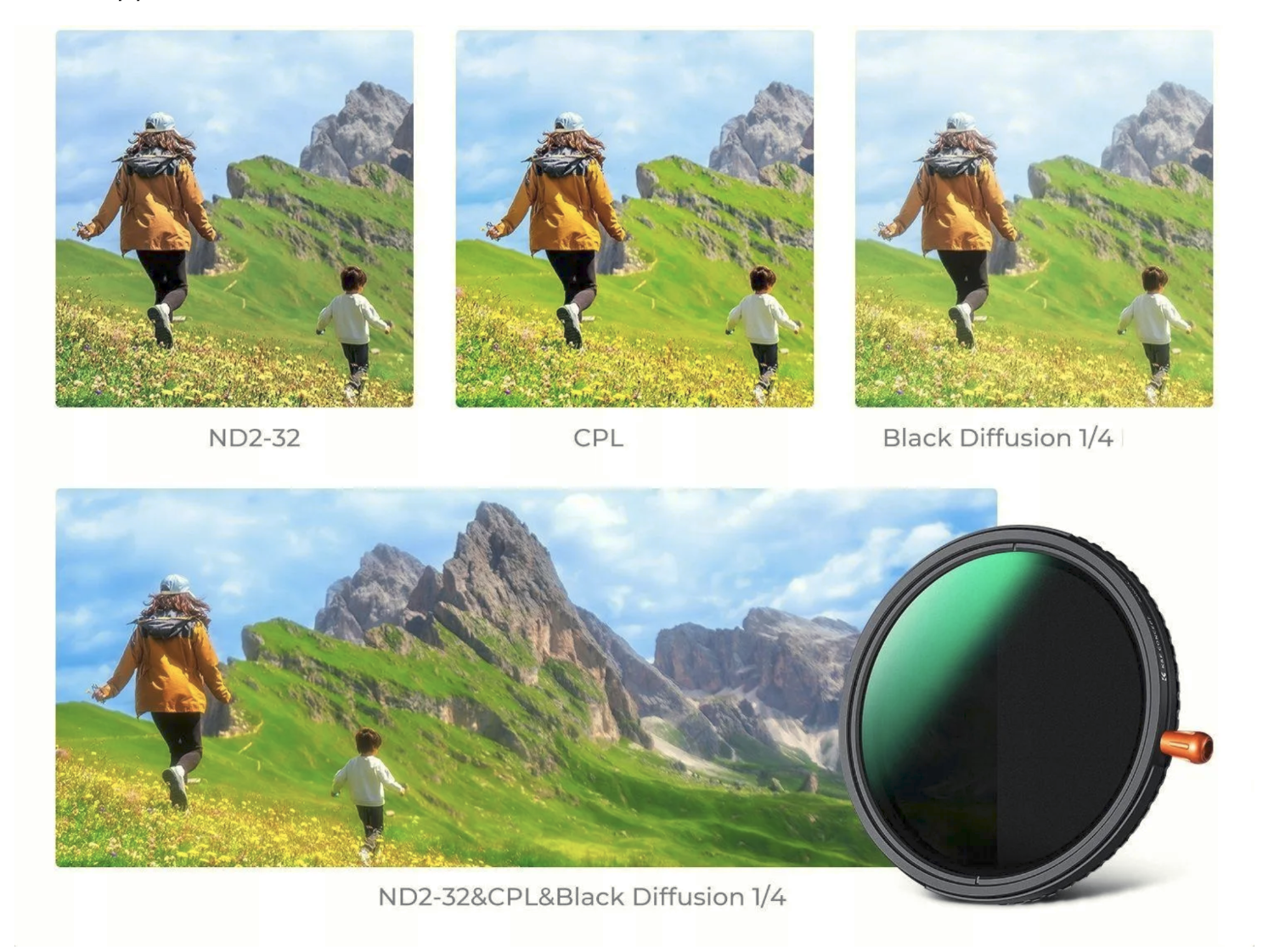 Hybridný filter K&F Concept 37 mm NANO C Series 3 v 1 kombinuje variabilný ND2–32, polarizačný filter CPL a difúzny filter Black Mist 1/4 do jedného kompaktného, vysoko výkonného riešenia. Je navrhnutý pre fotografov aj filmárov a ponúka presné ovládanie svetla, vylepšené farby a kontrast a filmový efekt mäkkého svitu – bez nežiaduceho čierneho „X“, ktorý je bežný u mnohých variabilných ND filtrov.
