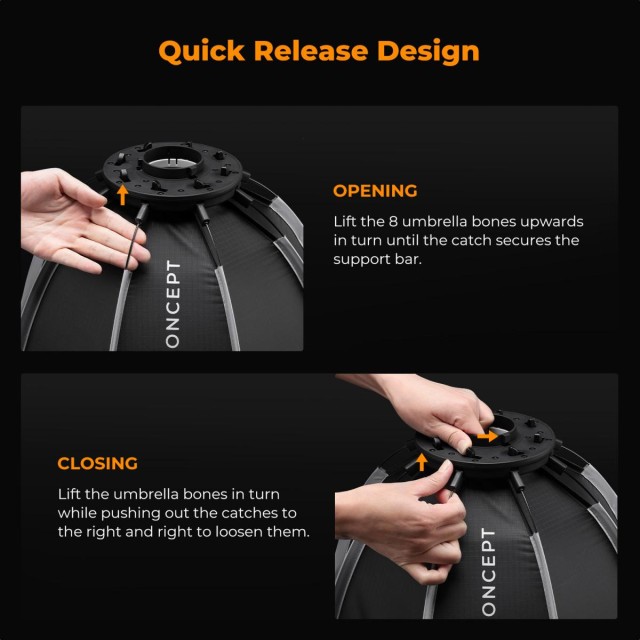 Integrovaná konštrukcia rebier softboxu a rukoväte nevyžaduje žiadnu montáž. Stačí vytiahnuť všetkých 8 rebier a za pár sekúnd máte hotovo. Ak chcete zostaviť, nadvihnite každé rebro a zatlačte rukoväť doprava, aby sa rýchlo uvoľnila.