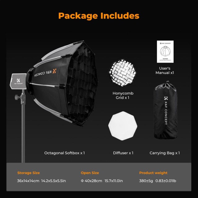 Osemuholníkový softbox K&F 40 cm s mini držiakom Bowens je ideálnym príslušenstvom pre fotografov a kameramanov, ktorí chcú dosiahnuť vynikajúce výsledky osvetlenia.