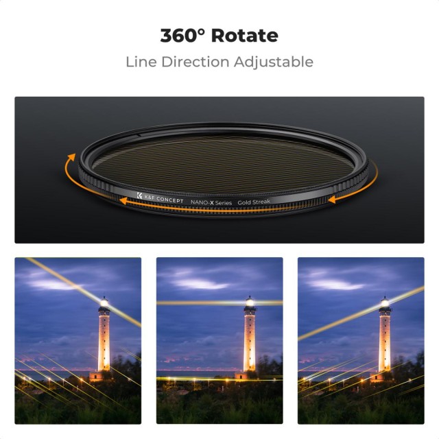 Inštaláciou zlatého filtra K&F Concept streak pred objektívom môžete dosiahnuť rovnaký efekt odlesku ako pri použití anamorfického objektívu. Nech už ide o fotografiu alebo video, tento filter pridá do vašich snímok lineárny efekt odlesku, čím vytvorí ohromujúce vizuálne efekty a zvýrazní umelecký dojem.