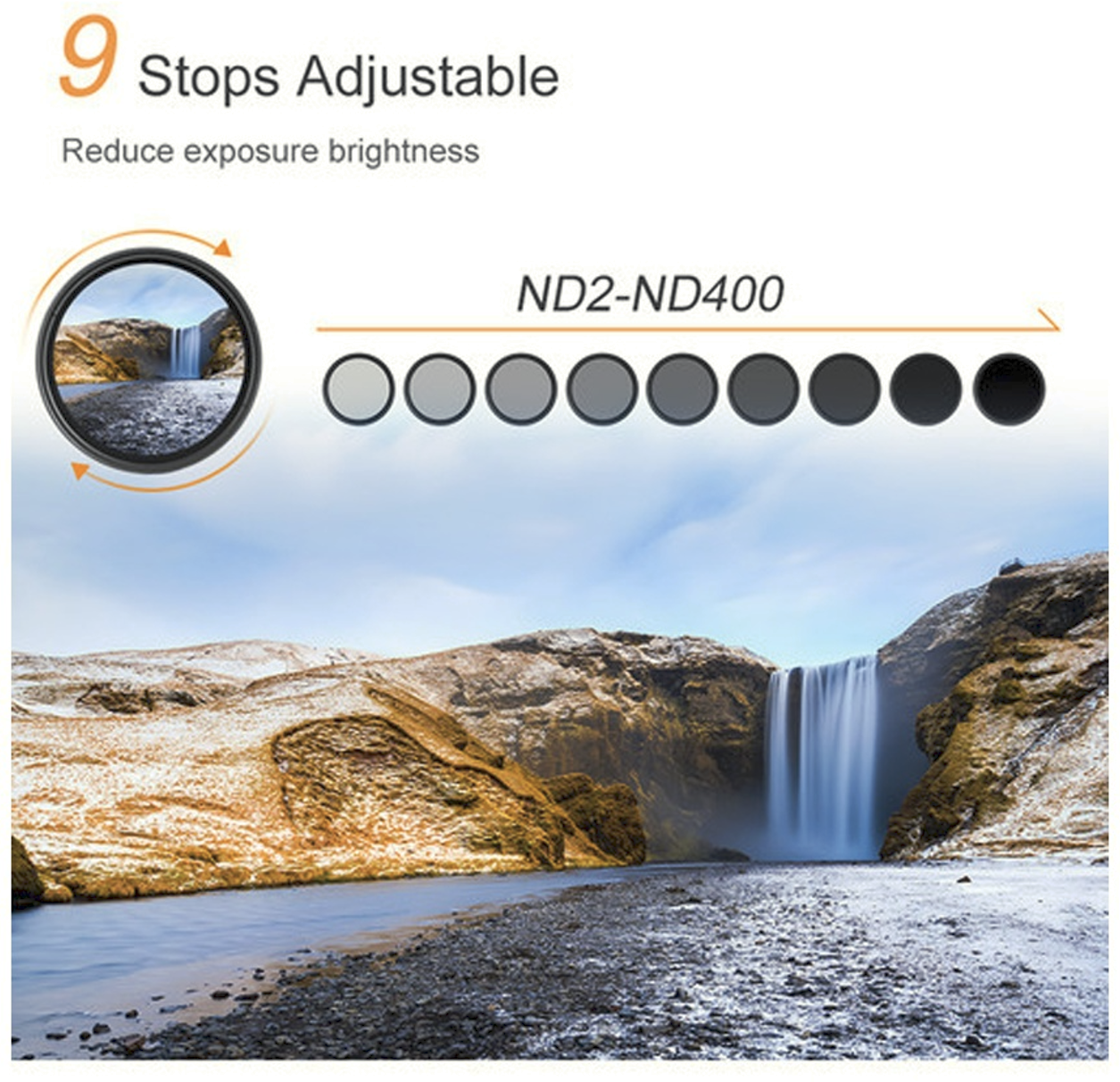 Filter K&F Concept 49 mm True Color Variable ND2–ND400 vám poskytuje presné ovládanie expozície od 1 do 9 stupňov pri zachovaní prirodzených a presných farieb. Je vyrobený z prvotriedneho japonského optického skla a viacvrstvových nano povlakov, čím zaručuje ostré, vysoko kvalitné snímky a plynulé video v jasných svetelných podmienkach – ideálny pre dlhé expozície, filmové zábery a fotografovanie s širokou clonou.