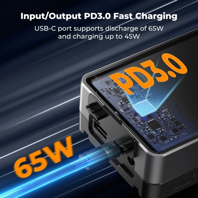 - Obojsmerné rýchle nabíjanie PD, podporuje viacero nabíjacích protokolov, napríklad PD3.0/2.0, rozhranie USB-C podporuje vybíjanie až do 65 W, nabíjanie až do 45 W, batériu plne nabije za menej ako 2 hodiny a zároveň môže nabíjať mobilné zariadenia, napríklad počítače/mobilné telefóny;
