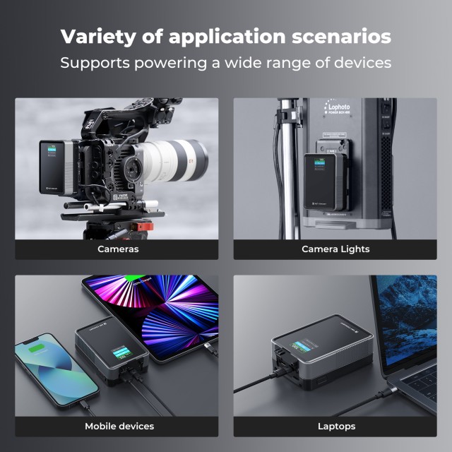 - Štandardná kapacita, malé rozmery, ale s kapacitou 50Wh, 3400 mAh, napríklad nabíjanie iPhone 15/16 Pro Max 2 krát, nabíjanie iPad Pro 12,9 palca (2022) 0,8 krát, nabíjanie notebooku MacBook Pro 14 palcov (2021) 0,6 krát, napájanie 60W COB video svetla približne 40-50 minút.