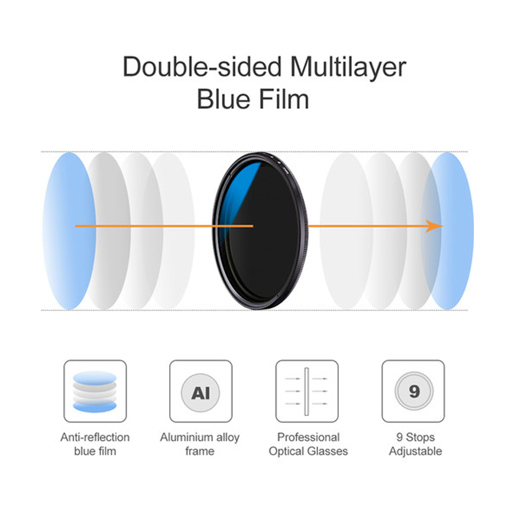 Filter K&F Concept 55 mm True Color Variable ND2–ND400 je ultratenký, vysoko presný nastaviteľný neutrálny filter určený na zníženie prichádzajúceho svetla bez zmeny farebnej presnosti. Je vyrobený z prvotriedneho optického skla a má viacvrstvovú odolnú povrchovú úpravu. Ponúka plynulú kontrolu expozície pre fotografovanie s dlhou expozíciou, fotografovanie s širokou clonou a kreatívne pohybové efekty.
