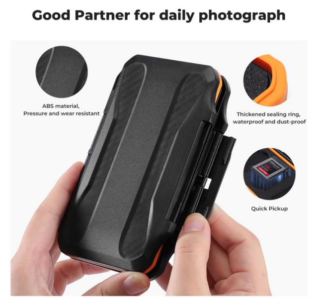 - Odolná ochrana: Odolný plášť vyrobený z prvotriedneho materiálu ABS chráni pamäťové karty pred poškriabaním, nárazmi a každodenným opotrebovaním. Silikónový tesniaci krúžok zabezpečuje vynikajúcu odolnosť voči vode, prachu a nečistotám, čím chráni vaše karty v náročných prostrediach.