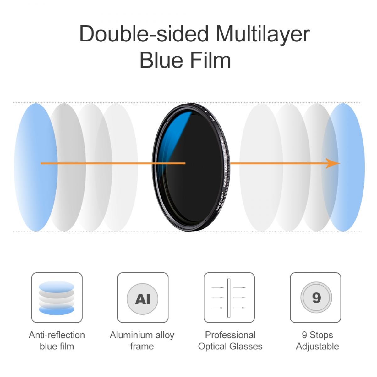 Filter je vyrobený z prvotriedneho optického skla, poskytuje vynikajúcu čistotu a minimalizuje optické skreslenie. Otáčaním predného prvku je možné plynulo prechádzať medzi úrovňami ND, čím sa nahrádzajú viaceré pevné filtre ND a poskytuje sa bezkonkurenčná flexibilita pri fotografovaní vonku. Ultra tenký hliníkový rám pomáha zabrániť vinetácii aj na širokouhlých objektívoch, zatiaľ čo jeho odolná konštrukcia zaručuje dlhodobú spoľahlivosť. Tento VND filter je ideálny pre fotografovanie krajiny, portréty s malou hĺbkou ostrosti, efekty rozmazania pohybu, videografiu za jasného denného svetla a kreatívnu prácu s dlhou expozíciou. Je nevyhnutným nástrojom na dosiahnutie konzistentnej expozície a umeleckého ovládania.
