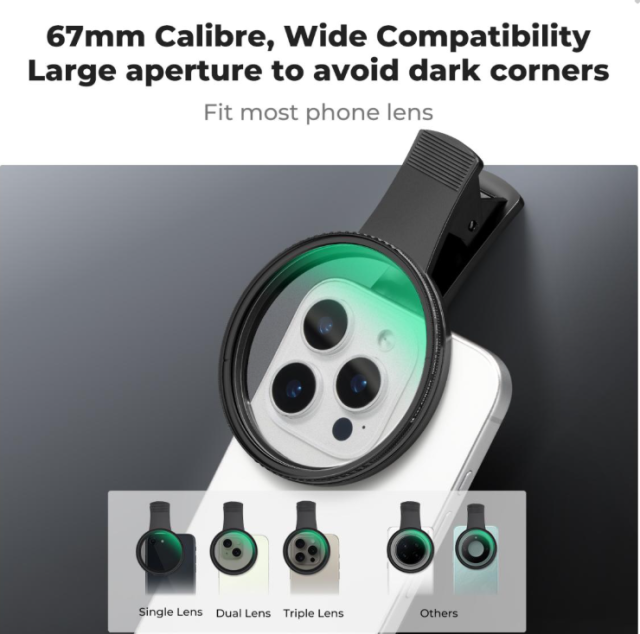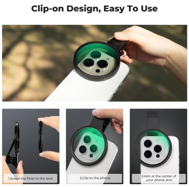 Filter je vyrobený s dôrazom na optickú dokonalosť a pýši sa 18 vrstvami pokročilej antireflexnej vrstvy, ktorá výrazne znižuje odrazy a duchov na povrchu, čím zabezpečuje krištáľovo čistý obraz aj za jasných podmienok a zachováva kontrast a detaily obrazu. Inštalácia je jednoduchá vďaka inovatívnemu dizajnu zadného klipu, ktorý filter bezpečne pripevní priamo k fotoaparátu vášho telefónu za pár sekúnd – bez potreby náradia, adaptérov alebo špecifických úprav pre konkrétny model, čo z neho robí bezproblémový doplnok vašej výbavy.