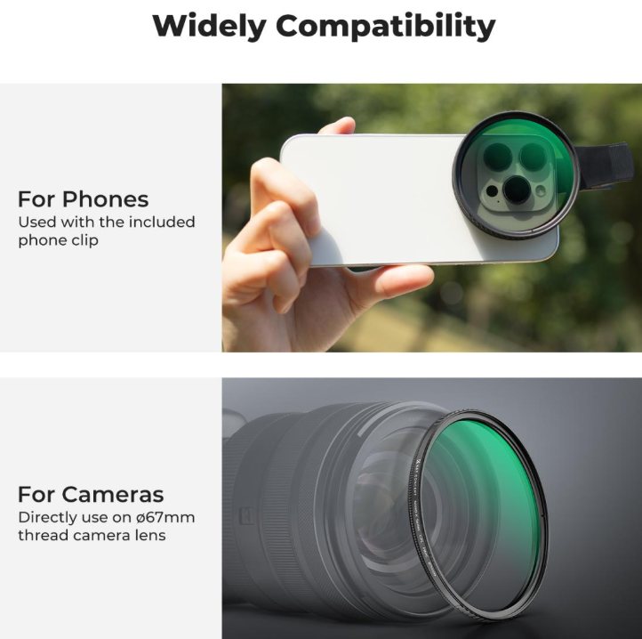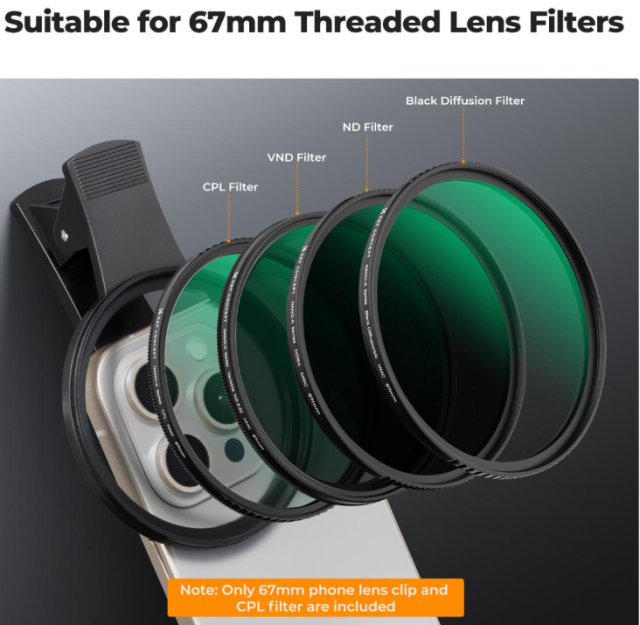 Súprava filtrov K&F 67 mm Clip-on CPL Phone Camera Lens Filter Kit je univerzálny doplnok určený pre všetky modely mobilných telefónov, ktorý obsahuje vysoko kvalitný 67 mm kruhový polarizačný filter (CPL), ktorý eliminuje nekovové odrazy, zvyšuje prirodzenú sýtosť farieb a redukuje lesk z mastnej pleti, čím zabezpečuje ostrejšie a živšie fotografie. Vďaka jednoduchému systému upevnenia pomocou zadného klipu, ktorý nevyžaduje žiadne náradie, 18-vrstvovej antireflexnej vrstve pre minimálne odlesky a priloženému čistiacemu obrúsku a vrecku na uloženie poskytuje táto sada profesionálne výsledky na cestách.