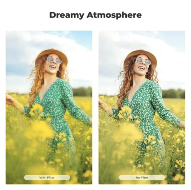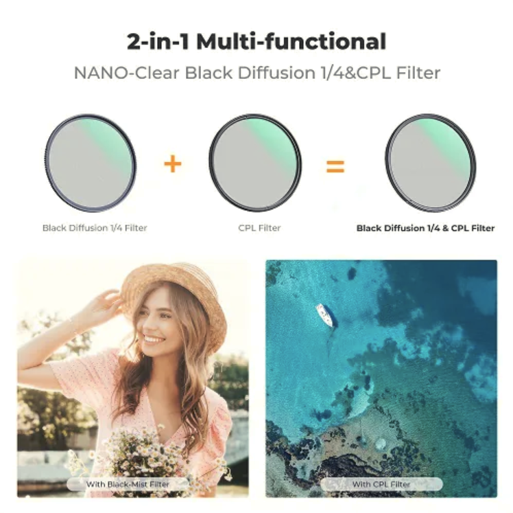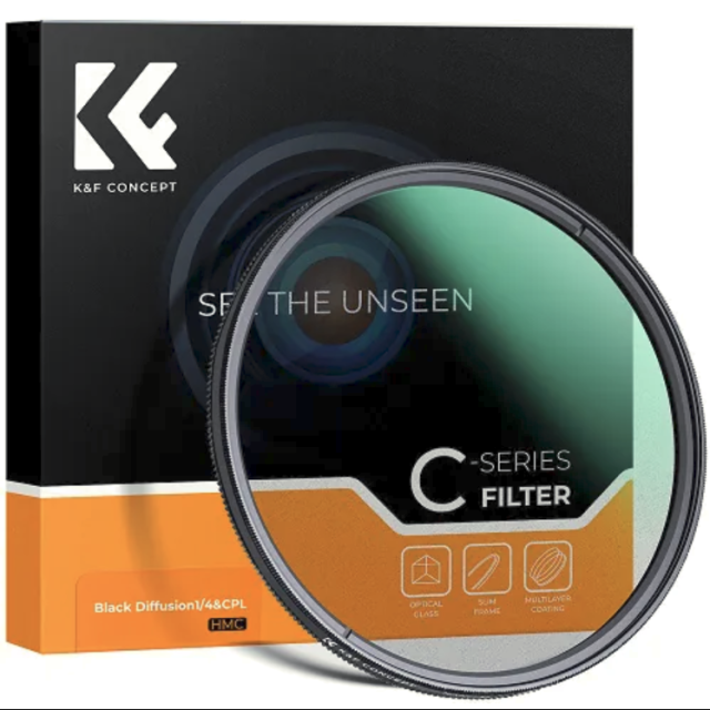 Filter K&F Concept 72 mm 2 v 1 Black Mist 1/4 + CPL kombinuje filmovú difúziu s presnou kontrolou polarizácie, čím poskytuje zmiernené svetlá, zvýraznené tiene, znížené odrazy a vylepšené farby – to všetko v tenkom, odolnom dizajne s viacerými vrstvami, ktorý je ideálny pre portréty, krajiny a profesionálnu prácu s videom.