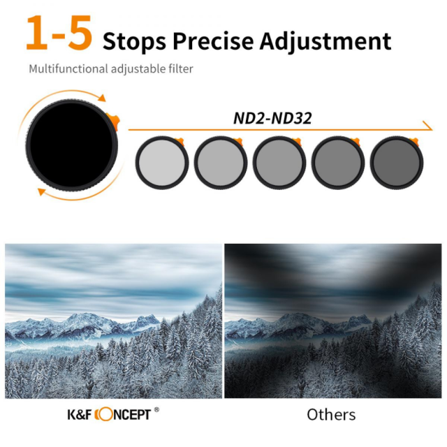 Tento filter má funkcie ND & black difúzny 1/4 efektový filter, nielenže môže kontrolovať množstvo svetla vstupujúceho do objektívu prostredníctvom nastavenia (1-5 stupňov ), ale tiež vytvára efekt filmového sna pre fotografie a video.