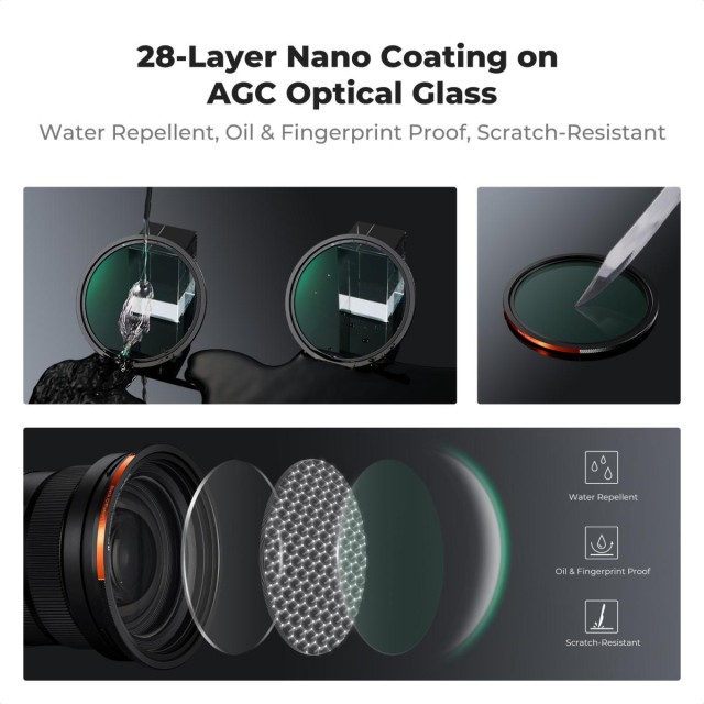 Každý filter je vyrobený z japonského skla AGC a chránený 28-vrstvovým nano povlakom, čím poskytuje maximálnu čistotu a odolnosť voči vode, oleju, škrabancom, odtlačkom prstov a škvrnám. Technológia vernosti farieb eliminuje nežiaduce farebné odlesky a zaisťuje presné, realistické výsledky priamo z fotoaparátu. Táto sada, doplnená kompaktným puzdrom pripraveným na cestovanie, poskytuje všetko potrebné na fotografovanie krajín, portrétov, filmovanie a každodenné kreatívne fotografovanie.
