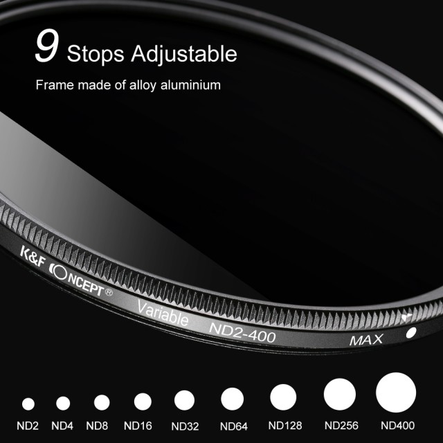 K&F Concept 77MM Slim Variable/Fader NDX, ND2~ND400 znižuje množstvo svetla vstupujúceho do objektívu, čím znižuje rýchlosť uzávierky fotoaparátu. Je to užitočné v situáciách, keď je potrebné vytvoriť pohybovú neostrosť (rieky, vodopády, pohybujúce sa osoby) alebo keď je potrebné použiť veľkú clonu s bleskom, aby sa zabránilo preexponovaniu.
