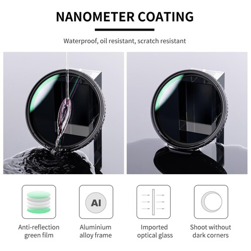 * 【Funkcia ND filtra】Hlavnou funkciou variabilného ND filtra je znížiť vstup svetla bez ovplyvnenia celkového vyváženia farieb pre techniky dlhej expozície a rozmazania pohybu pri meniacom sa svetle.