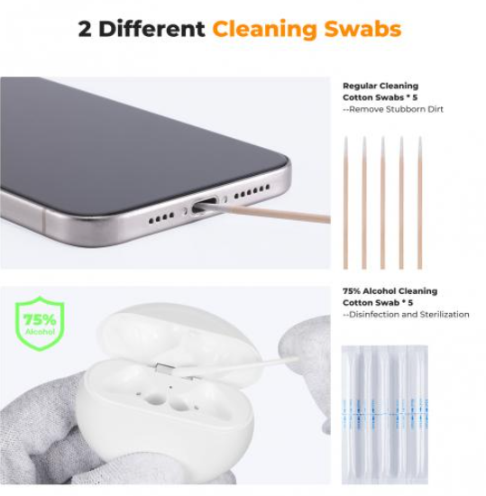 Súprava K&F Concept Airpod Cleaner Kit je komplexné prenosné hygienické riešenie pre Bluetooth slúchadlá, ako sú AirPods, obsahujúce multifunkčné pero 3 v 1, ktoré integruje kefku s mäkkou hustotou na odstraňovanie odolných nečistôt z vonkajšej strany slúchadiel a puzdier, hubku na jemné utieranie povrchu a pamäťovú bavlnenú tyčinku (rozpínateľná pena, dĺžka 2 cm) na dôkladné čistenie oleja a prachu z priestorov slúchadiel bez zanechania zvyškov. Lepiaci mechanizmus s odtrhávacou páskou (na báze silikónu, bez zvyškov) priľne k filtrom výstupu zvuku a pri odstraňovaní extrahuje usadené častice, zatiaľ čo priložená alkoholová tyčinka (75 % izopropyl, predvlhčená bavlnená špička) denaturuje bakteriálne proteíny a účinne eliminuje 99 % bežných patogénov, ako sú stafylokoky a E. coli, čím zabezpečuje hygienickú dezinfekciu. Dokončovacia utierka z mikrovlákna (3 x 3 palce, 200 g/m² tkanina bez vlákien) leští povrchy do lesku bez šmúh, čím zabezpečuje, že sada pokryje všetky potreby čistenia – od počiatočného odstraňovania škvŕn až po finálne leštenie – v kompaktnom balení pripravenom na cestovanie (celková hmotnosť 50 g, rozmery 15 x 2 cm v zloženom stave). Je bezpečná pre citlivú elektroniku vďaka neabrazívnym materiálom (špongia Shore A 40, kefa bez elektrostatického náboja) a zabraňuje hromadeniu baktérií pri dlhodobom používaní, čím podporuje zdravší zvukový zážitok pre každodenných cestujúcich alebo nadšencov fitness.