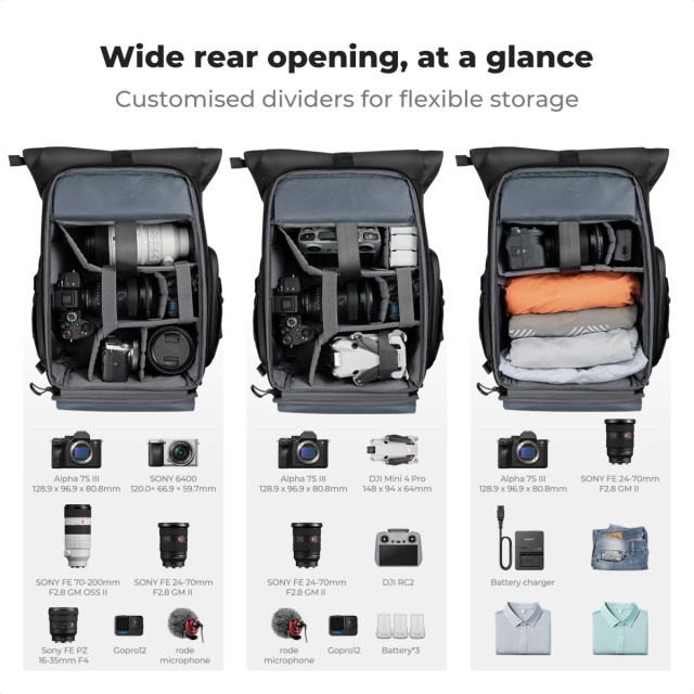 Batoh K&F Concept 20L Nature Wander 11 v elegantnej čiernej farbe je navrhnutý pre fotografov, ktorí vyžadujú rýchly prístup, inteligentnú organizáciu a celodenné pohodlie. Jeho inovatívny dizajn s otváraním v zadnej časti o 180° vám umožňuje batoh úplne otvoriť a vybrať vybavenie za pár sekúnd, zatiaľ čo odnímateľné polstrované priečky umožňujú prispôsobiť konfiguráciu pre telá DSLR/bezzrkadloviek, objektívy a príslušenstvo. Vďaka 4-litrovým horným a 2-litrovým predným rozširovateľným vreckám získate flexibilný priestor na osobné veci alebo ďalšie filtre. Špeciálne polstrované vrecko na 15,6-palcový notebook chráni vaše editovacie zariadenie a spodné popruhy na statív udržia zariadenia s dĺžkou až 50 cm. Vďaka viacerým vreckám, vrátane dvoch bočných, vnútorných sieťovaných priehradiek, držiakov na batérie a vrecka na pamäťové karty, budete mať všetky dôležité veci po ruke. Ergonomický zadný panel s prúdením vzduchu, priedušné polstrovanie a široké ramenné popruhy zabezpečujú ventiláciu a pohodlie pri dlhých túrach alebo fotografovaní v meste, vďaka čomu je tento batoh dokonalou kombináciou ochrany, univerzálnosti a dizajnu pripraveného na cestovanie.