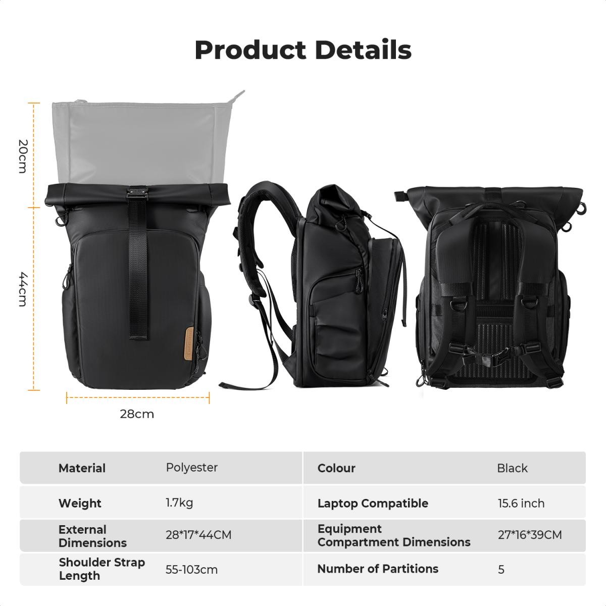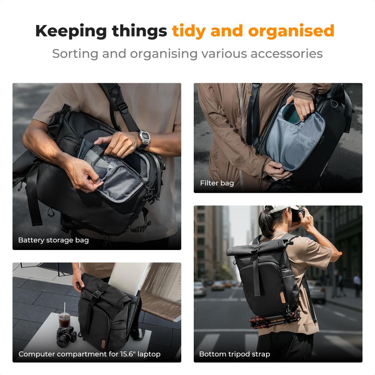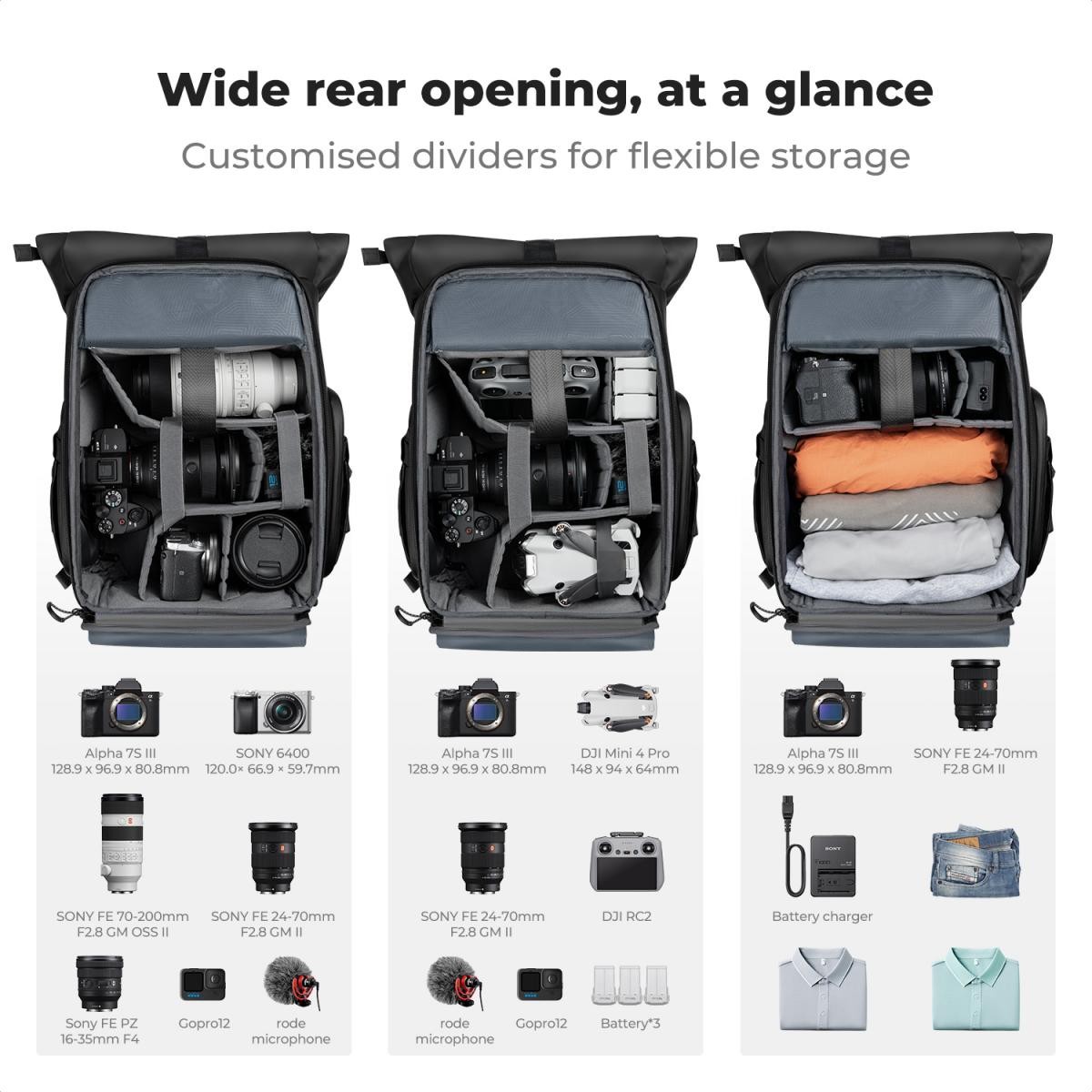 Batoh K&F Concept 20L Nature Wander 11 (čierny): Taška na fotoaparát s otváraním v zadnej časti v uhle 180° s flexibilnými priehradkami, puzdrom na 15,6-palcový notebook, rozširovateľným úložným priestorom s objemom 6 litrov a popruhmi na statív pre pohodlné celodenné fotografické dobrodružstvá.