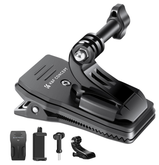 Dosiahnite všestrannosť s voľnými rukami pomocou držiaka s klipom na popruh batohu K&F Concept, ktorý je navrhnutý na bezpečné upevnenie, otáčanie o 360° a kompatibilitu so širokou škálou akčných kamier a smartfónov.