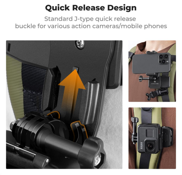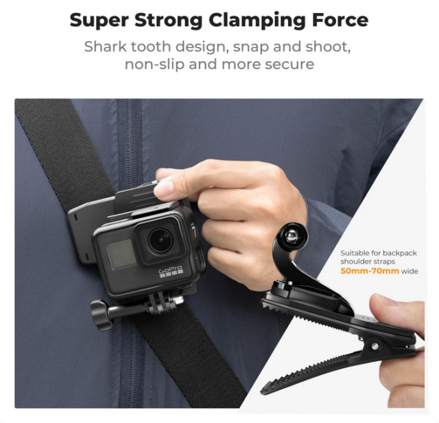 Rýchlo sa inštaluje a jednoducho používa, vďaka 4 cm otvoru a kompatibilite s popruhmi širokými 5-7 cm sa klip pevne pripevní k väčšine bežných popruhov batohov, čiapok a iných montážnych bodov. Podporuje širokú škálu zariadení vrátane modelov GoPro Hero, DJI Osmo Action, kamier Insta360 a smartfónov so šírkou od 65 do 102 mm.