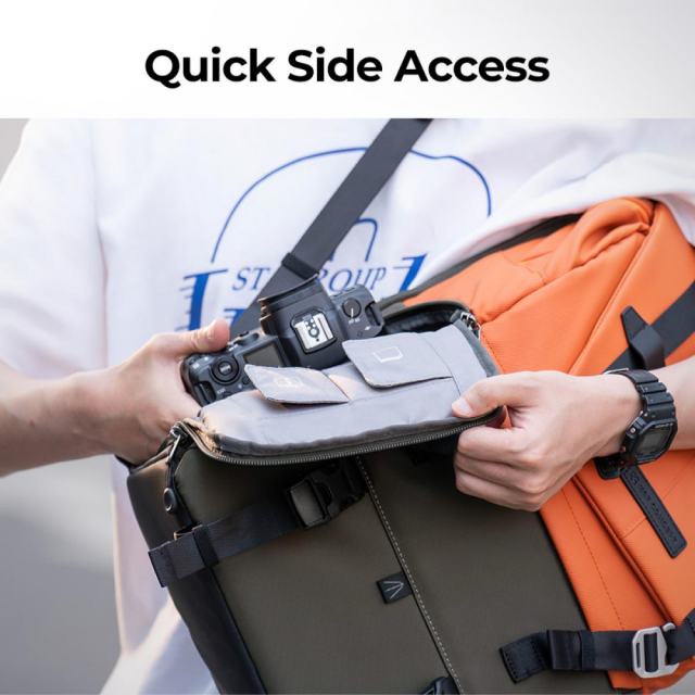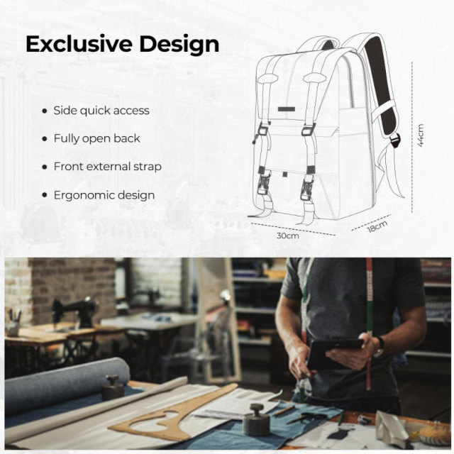 - Určené pre fotografov: Špeciálne vnútorné vrecká určené na uloženie fotografických náhradných dielov, ako sú filtre, adaptérové krúžky atď. Skryté predné vrecko na uloženie každodenného príslušenstva. v bočných vreckách môžete nosiť fľašu na vodu alebo dáždnik.