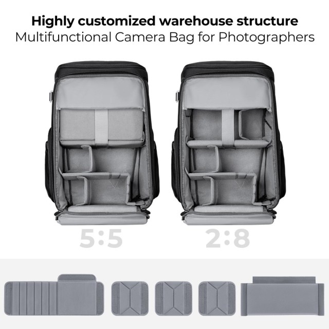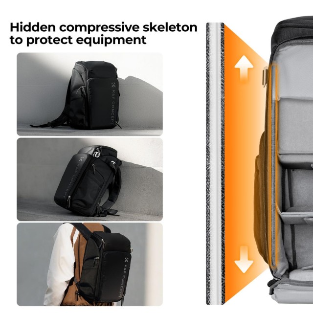 Fotografický batoh od spoločnosti K&F Concept má všestranný dizajn "Magic Bin Design" s možnosťou nastavenia priestoru, vďaka čomu je vhodný pre rôzne fotografické scenáre. Vďaka stabilnej vnútornej podpore, rozšíreniu kapacity, hornému a bočnému prístupu a zavesenej priehradke na počítač zaručuje bezpečnosť a pohodlie fotografom, najmä tým, ktorí sa venujú outdoorovej a portrétnej fotografii.