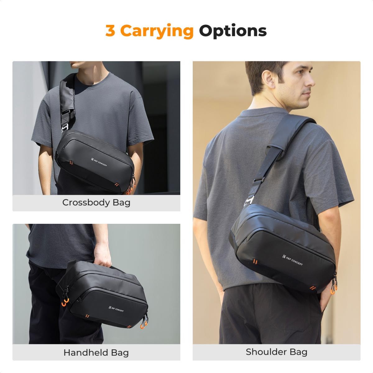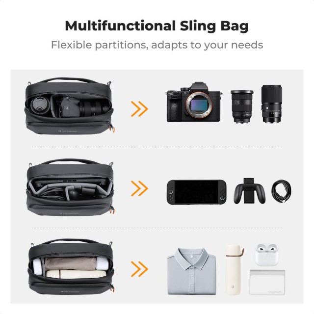 Digitálna taška K&F Concept Storage Sling Bag: Univerzálna technická taška typu „všetko v jednom“ pre tvorcov, do ktorej sa zmestí Steam Deck, DJI Pocket 3, bezzrkadlové fotoaparáty a nevyhnutné príslušenstvo, s prispôsobiteľnými priehradkami, vodoodpudivou ochranou a tromi možnosťami nosenia.