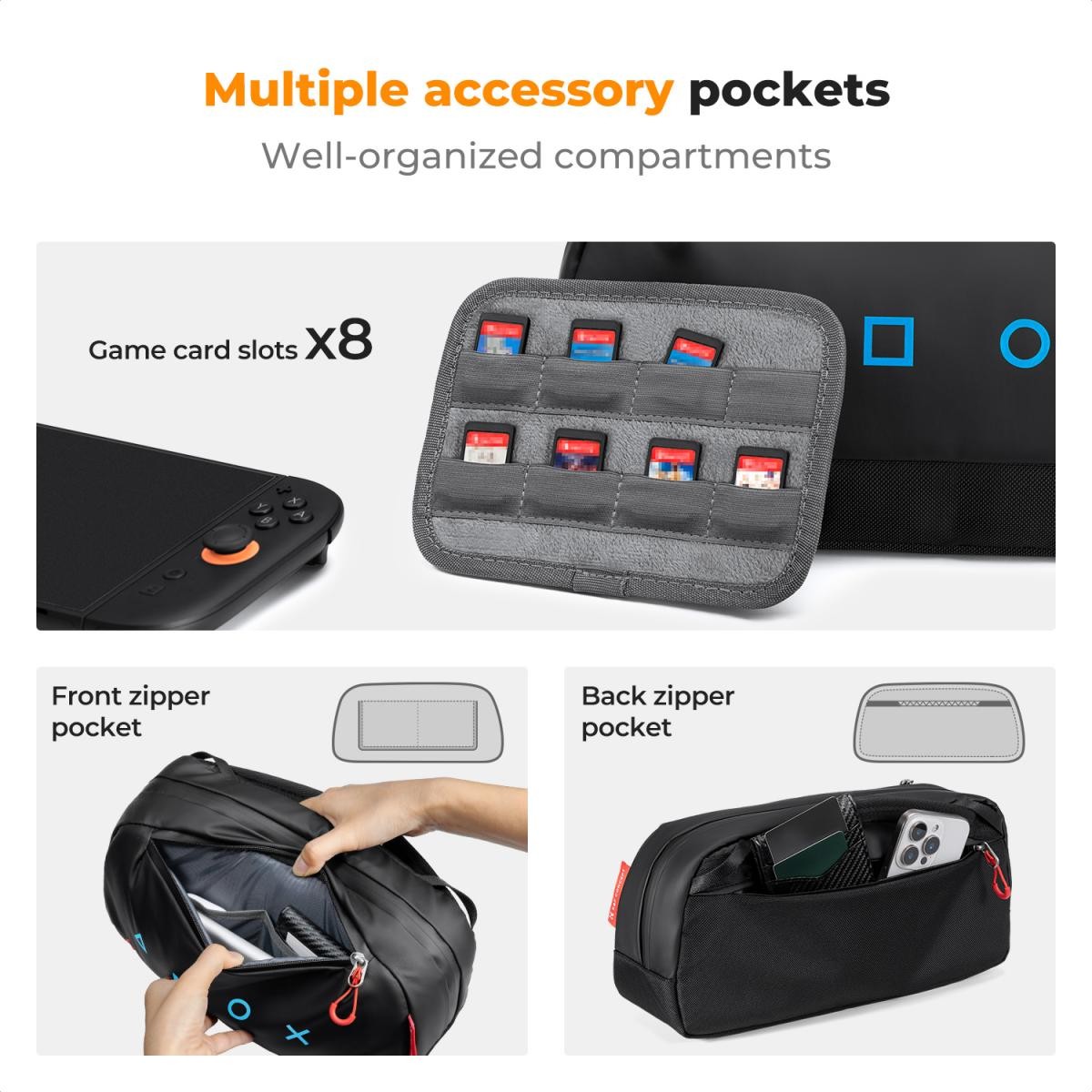 K&F Concept Digital Storage Travel Sling Bag: Tenké, vodotesné puzdro cez rameno pre Steam Deck OLED, Nintendo Switch 2, PS Portal a prenosné konzoly s prispôsobiteľnou priehradkou v tvare W, zamatovou podšívkou odolnou proti poškriabaniu, držiakom na 8 herných kariet a vreckom proti krádeži.