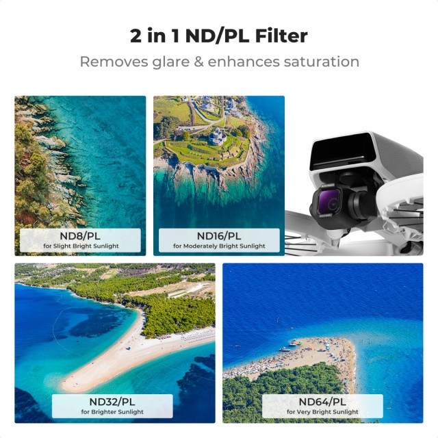 Každý filter kombinuje funkcie ND a CPL, čo pomáha kontrolovať expozíciu a eliminovať nežiaduce odlesky. Filtre ND8/PL, ND16/PL, ND32/PL a ND64/PL znižujú množstvo svetla o 3, 4, 5 a 6 stupňov a zároveň potláčajú odrazy z nekovových povrchov (napr. voda, sklo). Zvyšujú tiež kontrast a sýtosť modrej oblohy a bielych mrakov.