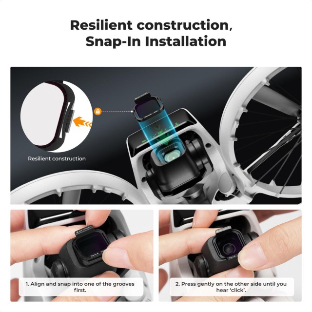 Filtry sú vybavené systémom zapínania, ktorý perfektne pasuje na kameru DJI Flip 4K UHD. Stačí ich nasadiť a môžete ihneď začať snímať letecké zábery.