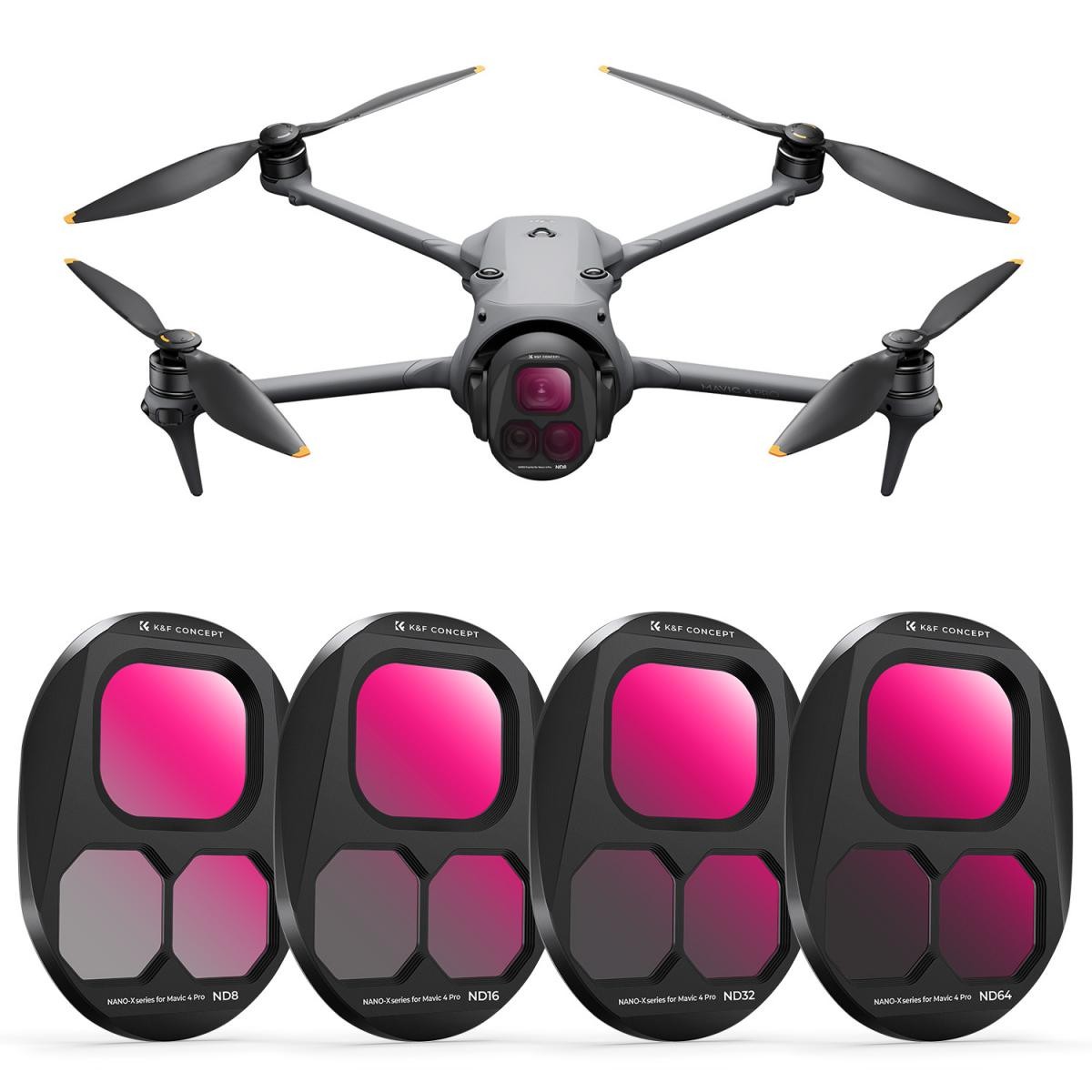 Súprava filtrov K&F CONCEPT DJI Mavic 4 PRO ND SKU1640 obsahuje filtre ND8, ND16, ND32 a ND64 pre presné ovládanie expozície. Vychutnajte si úžasnú leteckú fotografiu a videografiu s týmito profesionálnymi HD objektívmi. Ich obojstranná vrstva ponúka zvýšenú odolnosť a je vodotesná pre spoľahlivé použitie za akýchkoľvek podmienok.