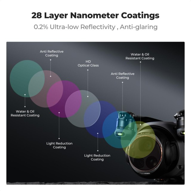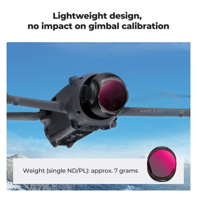 Táto sada filtrov ND CPL 2 v 1 je špeciálne vyrobená pre DJI Mavic 4 Pro a obsahuje 4 balenia – ND8&PL+ND16&PL+ND32&PL+ND64&PL. Ľahko sa inštaluje, rovnakým spôsobom ako originálny ochranný objektív DJI. Vyrobené z importovaného optického skla AGC s viacvrstvovým povlakom, znižujú odlesky a odrazy objektívu a zabezpečujú obnovenie skutočných farieb obrazu.