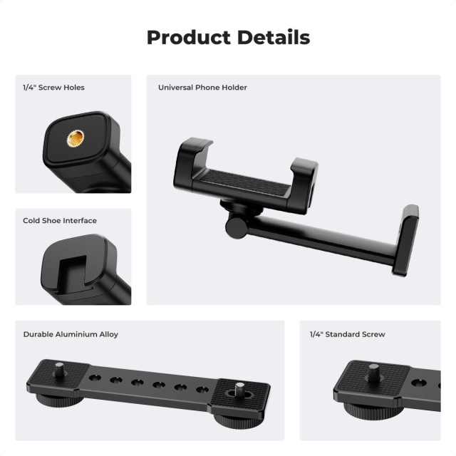 Vylepšite svoje zážitky z natáčania s DJI Osmo Pocket 3 pomocou stojana na mobilný telefón K&F Concept, ktorý je navrhnutý tak, aby sa dal bezproblémovo pripojiť k vášmu smartfónu a poskytoval väčšiu obrazovku a presnejšie ovládanie vašej kamery. Spojovacia základňa je vyrobená z CNC opracovanej eloxovanej hliníkovej zliatiny, zatiaľ čo svorky na telefón sú vyrobené z vysoko kvalitného plastu PC+ABS a nehrdzavejúcej ocele, čo zaručuje bezpečné a stabilné pripojenie. Univerzálny dizajn umožňuje 360° horizontálne a vertikálne otáčanie spolu s 180° nastavením sklonu, takže môžete snímať zábery prakticky z akéhokoľvek uhla. Jeho bohaté možnosti rozšírenia zahŕňajú šesť dodatočných 1/4" portov na základni, čo dáva celkom osem, plus studený pätník a 1/4" port na samotnej svorku telefónu. Jednoducho pripevnite statívy, selfie tyče, mikrofóny alebo doplnkové svetlá, aby ste vylepšili svoj zážitok zo snímania. Ideálne pre tvorcov, ktorí požadujú flexibilitu, stabilitu a profesionálne nastavenia v jednom kompaktnom príslušenstve.