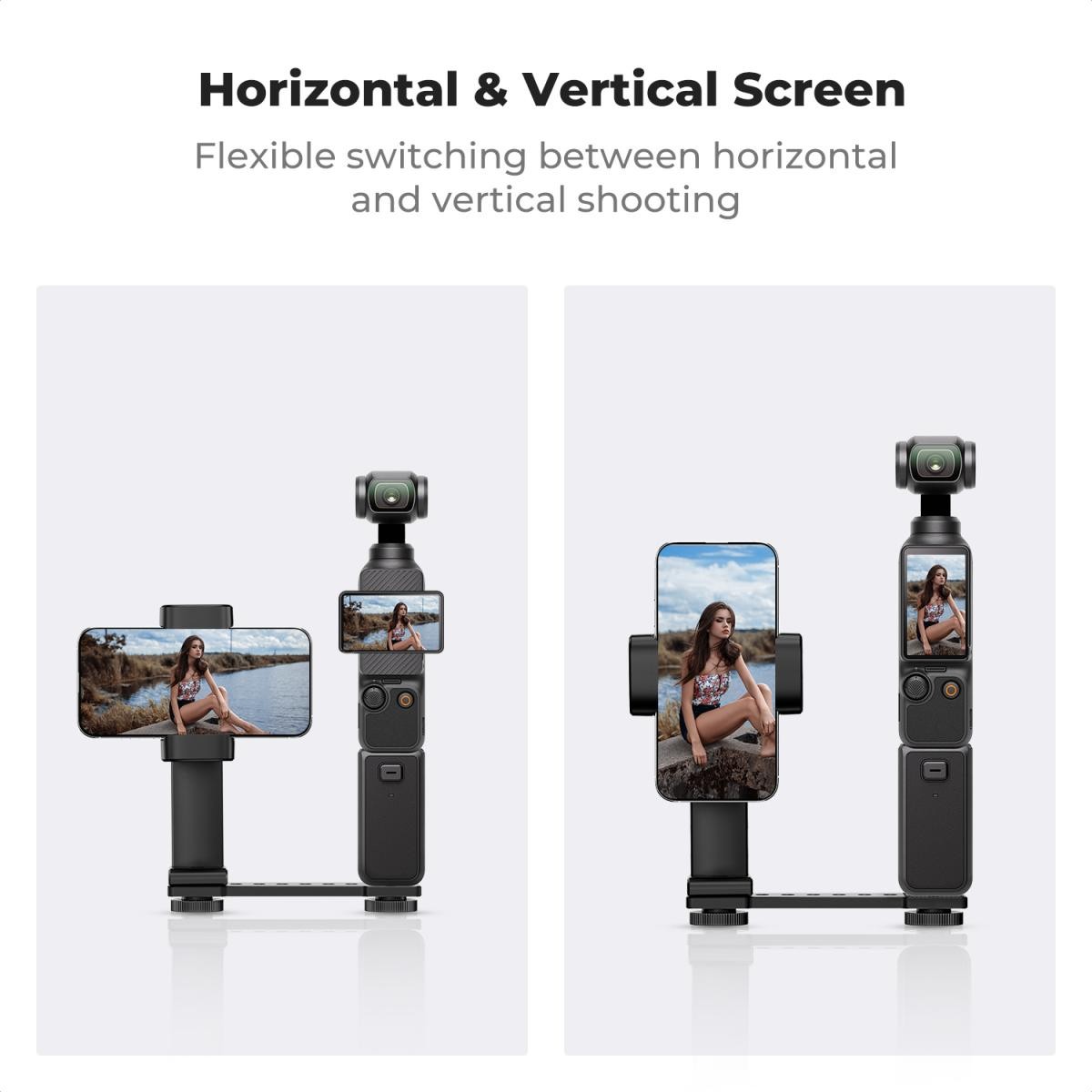 Stojan na mobilný telefón K&F Concept DJI Osmo Pocket 3 je dokonalým doplnkom pre váš Pocket 3, ktorý bezproblémovo integruje váš smartfón pre zväčšený obraz a vylepšené ovládanie fotoaparátu. Je vyrobený z vysoko kvalitnej zliatiny hliníka a odolného plastu PC+ABS s nerezovou oceľou, čo zaručuje stabilné a bezpečné pripojenie. Vďaka univerzálnemu horizontálnemu a vertikálnemu otočeniu o 360°, nastaveniu sklonu o 180° a viacerým možnostiam upevnenia, vrátane studenej pätice a 1/4" portov, je ideálny pre statívy, svetlá, mikrofóny a ďalšie príslušenstvo.