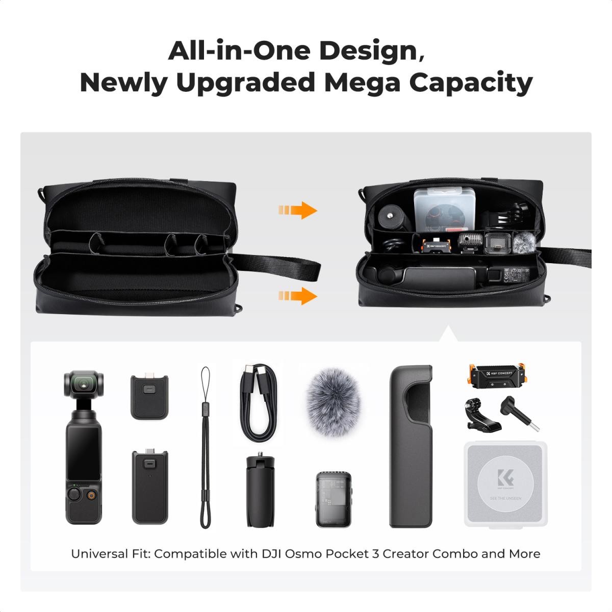 Taška K&F pre DJI Osmo Pocket 3. Udržujte svoje vybavenie v bezpečí a štýlovo s oficiálnou taškou DJI Osmo Pocket 3. Táto elegantná taška, navrhnutá špeciálne pre Creator Combo, ponúka bezpečné uloženie vašej kamery a základného príslušenstva.