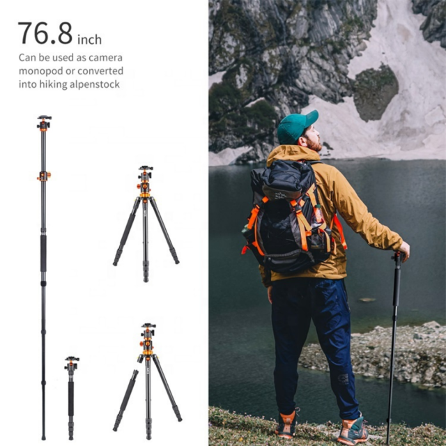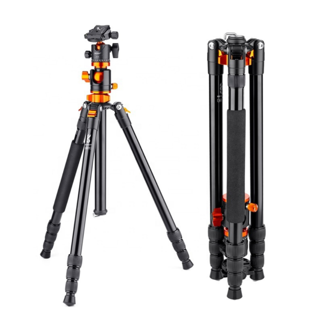 Hliníkový statív K&F Concept 09.090 ponúka ľahkú a kompaktnú konštrukciu s nosnosťou do 10 kg a nezávisle nastaviteľné nohy na bezpečnú prácu aj v náročnom teréne. Nohy majú veľké zámky s prackami na veľmi rýchlu konfiguráciu nastavenia fotoaparátu/DSLM; statív sa dá samozrejme nastaviť aj nízko (56 cm) a zložiť do ľahko prenosnej dĺžky 48 cm. Odnímateľná noha umožňuje používať statív v režime monopodu v kombinácii so stredovým stĺpikom až do maximálnej dĺžky 195 cm! Súprava obsahuje aj 28 mm guľovú hlavu s možnosťou uzamknutia v režime panorámy a ľahko čitateľnou stupnicou.