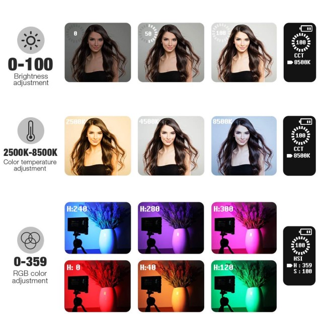 Plnofarebné RGB výplňové svetlo Vreckové svetlo Zabudovaná 12w nabíjateľná batéria LED svetlo kamery 360° 12 svetelných efektov Panelové video svetlo z hliníkovej zliatiny
