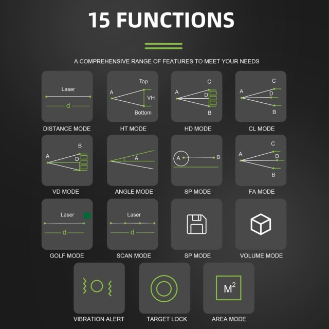 * 15 funkcií a automatické ukladanie údajov: meranie vzdialenosti, meranie výšky v dvoch bodoch, horizontálna vzdialenosť, najbližšia vzdialenosť, vertikálna výška, meranie rýchlosti, meranie objemu a mnoho ďalších 15 užitočných meraní s komplexnou škálou funkcií, ktoré uspokojí vaše rôzne potreby. Režim použitý pred vypnutím sa po vypnutí zaznamená a zostane v režime použitom pred ďalším zapnutím, bez toho, aby ste ho museli znovu nastavovať.