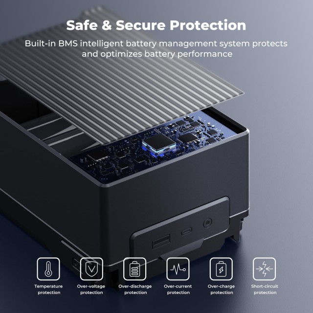 - Bezpečná a spoľahlivá: Batéria V Mount používa vysoko kvalitné značkové batériové články, inteligentný systém BMS poskytuje viacero ochrán, vrátane ochrany proti nadprúdu, skratu, prehriatiu a prepätiu