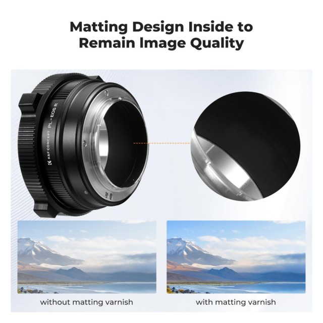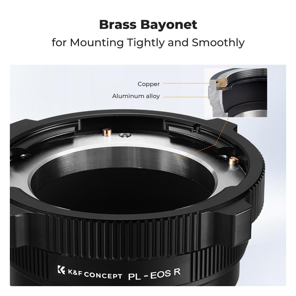 Vysoko presný adaptér K&F Concept PL-EOS R: Manuálny adaptér PL na Canon RF s nekonečným zaostrením, konštrukcia z tvrdo eloxovaného hliníka pre sériu EOS R a vybrané fotoaparáty LUMIX/Sigma.