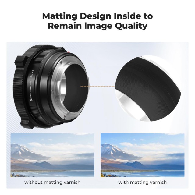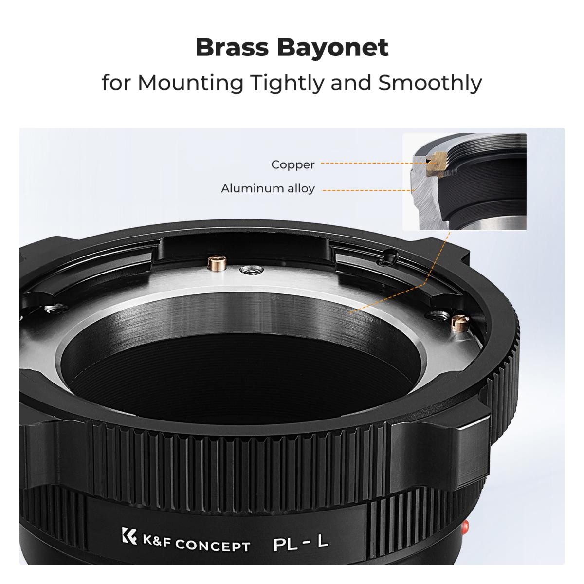 Vysoko presný adaptér K&F Concept PL-L: Manuálny adaptér PL na L-mount s nekonečným zaostrením, tvrdo eloxovaným hliníkom a matným vnútrom pre fotoaparáty Leica, Panasonic LUMIX a Sigma L-mount.