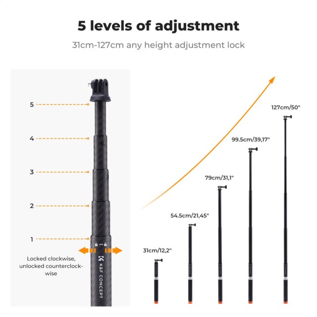 K&F Concept Invisible Selfie Stick je predlžovacia tyč z uhlíkových vlákien, ktorá sa vysunie až do 127 cm (50 palcov) a poskytuje diskrétne selfie bez viditeľných stôp po tyči. Je ľahká, odolná a kompatibilná s akčnými kamerami a smartfónmi, ponúka vynikajúcu stabilitu a jednoduchú prenosnosť na bezproblémové selfie a natáčanie videí.
